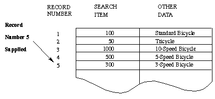 A second method of accessing a data entry is directed access. With this method, Eloquence DBMS returns the record specified by a record number supplied by a program. If the specified record is non-empty the record is transferred to the data buffer. If the record is empty a status error is returned. In either case, the current record is set to the record specified. Directed access is used to read entries following a SORT or FIND operation.