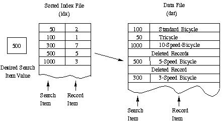This example also shows two deleted (blank) records. When a record is deleted from a data file, the space taken by that record still remains in the file. When a new record is added, it takes an available space left by a deleted record. If there are no deleted (blank) records, the new record is added to the end of the file.