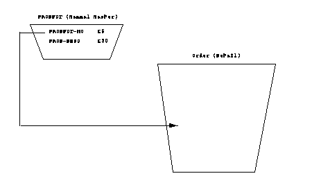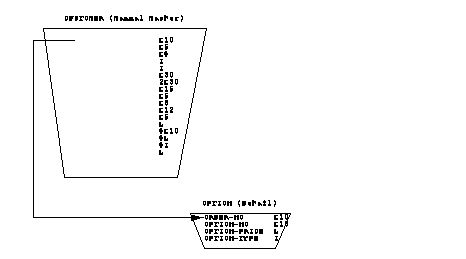 The database structure shown next could be used to store the required data. This structure offers little advantage over using a direct (random) access data file, but does provide a starting point for the database design. Notice that in order to generate a list of all orders for a particular product, all entries in the detail set must be scanned. Also no provision is made in this structure to handle an order which includes more than four options. In order to provide a common basis for diagramming database designs, pentagons are used to represent manual master data sets, triangles are used to represent automatic master data sets, and trapezoids are used to represent detail data sets. The item names and item types used to define the data entry within the data set are also shown.