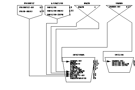The advantages of the previous two structures are incorporated into the structure shown below. The CUSTOMER data set contains all order information except for option data, which is stored in the OPTION data set. Options are logically linked to the order through the ORDER master data set. Orders for a particular product are chained together using the PRODUCT master set.
