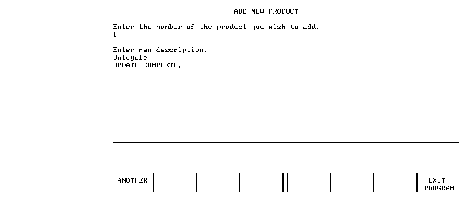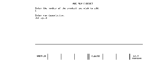 If the description is altered and RETURN is pressed, the DBUPDATE line (1520) alters the text of the product description in the database. In this case, either ANOTHER or EXIT PROGRAM is pressed to continue: