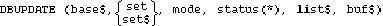 The DBUPDATE statement is used to modify values in an existing record in the database (search item values cannot be modified). If an IN DATA SET is active on the specified data set, buf$ will be updated with the current values of the appropriate variables before the operation.